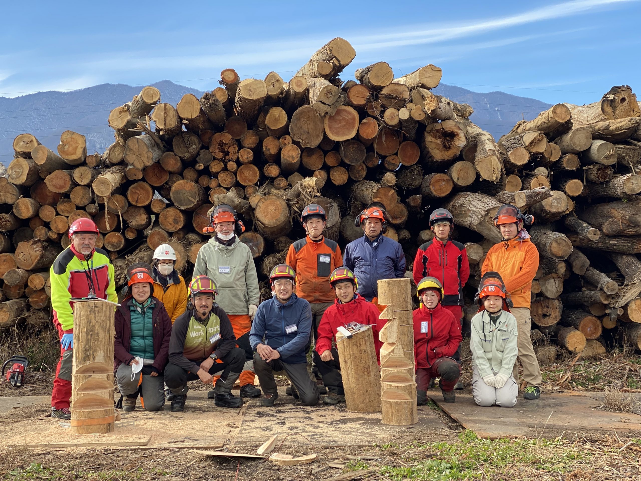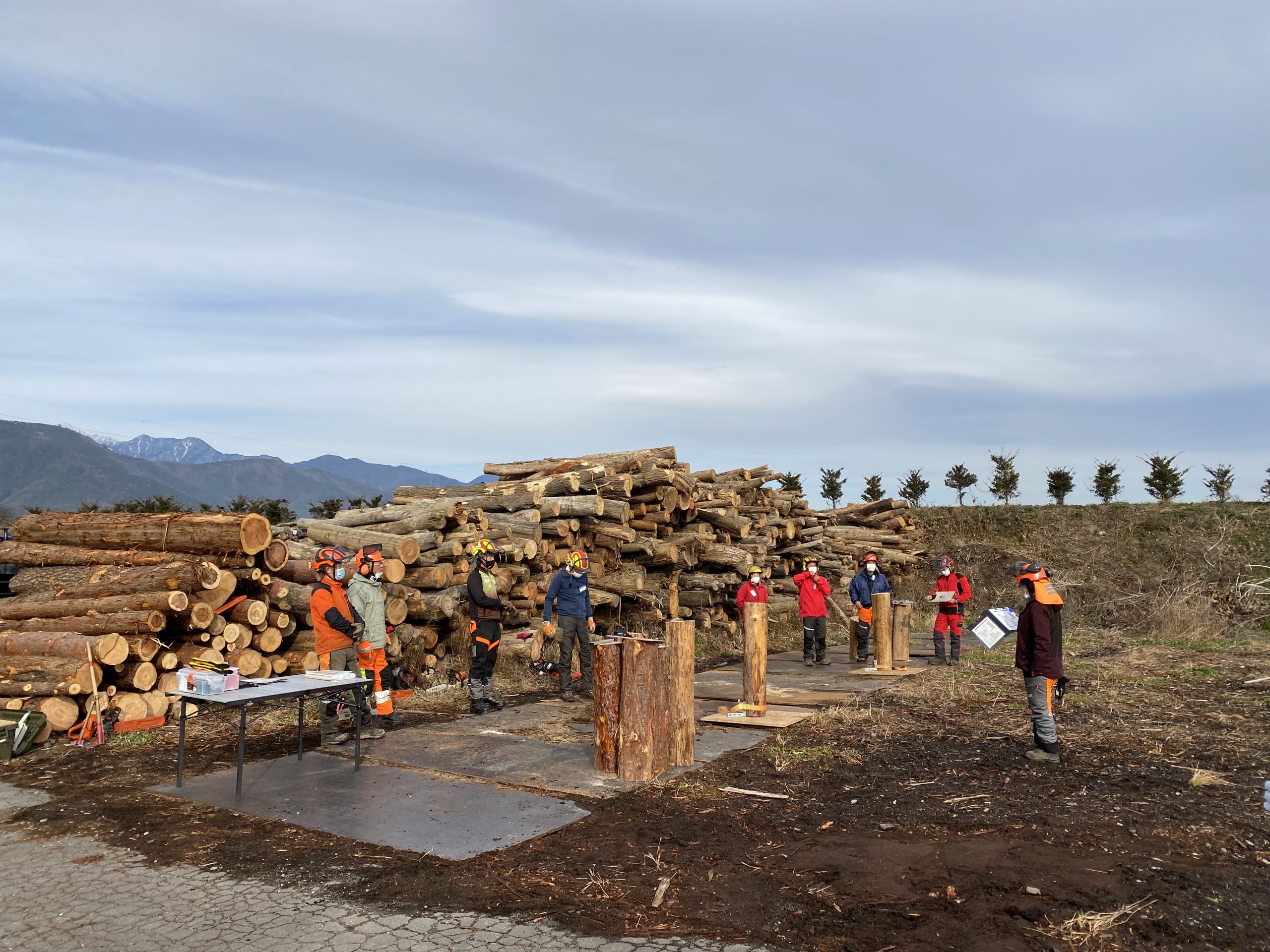 11月29日(月曜日)中信木材センターの貯木場で、1か月間取り組んで頂いたチェーンソー操作技能の自己練習成果発表と、操作技能の課題解決方法、ならびにチェーンソー操作技能の指導方法などの実習を行いました。