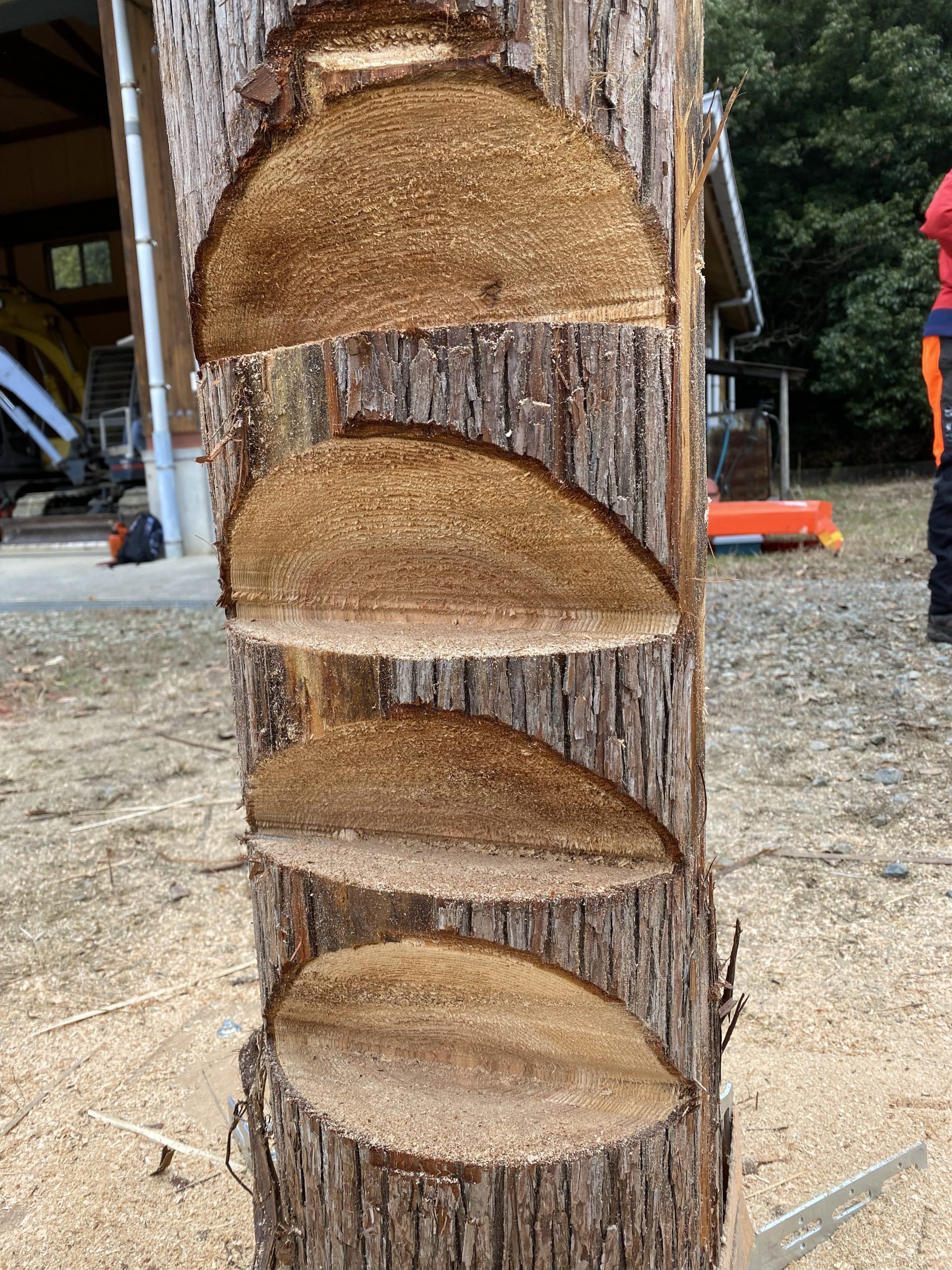 - ツルの指定寸法は幅3㎝、高さ5㎝に指定し、伐木後の左右のツルの幅と高さを計測します。また、受け口の深さは、7㎝、斜め切りの角度は45度に指定してチェーンソーで伐り、その指定寸法の再現性を計測しました。