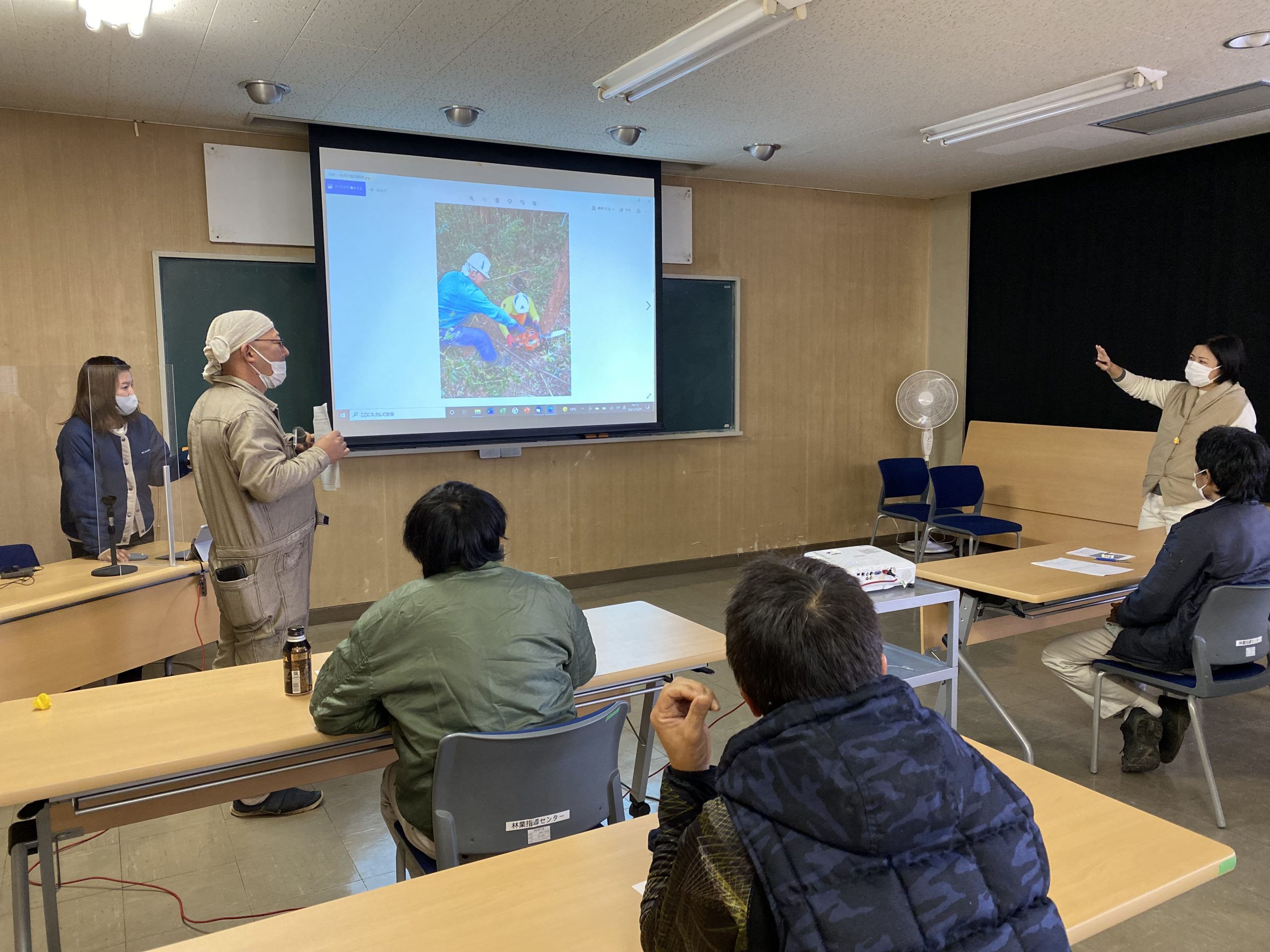12月21日(火曜日)山口県林業技術センター研修室で1か月間の振り返りワークショップ(座学)と、林業安全ゲームを使用した伐倒技術向上と安全作業のポイントの振り返りを行いました。